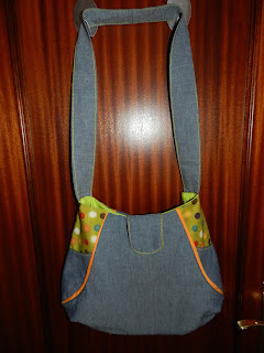 Estoy muy contenta con el resultado, aunque tiene sus fallos porque poner el bies no fue tarea fácil!! Aqui os enseño una foto para que veais el detalle del pespunte como los vaqueros en el asa, cierre y bolsillos.